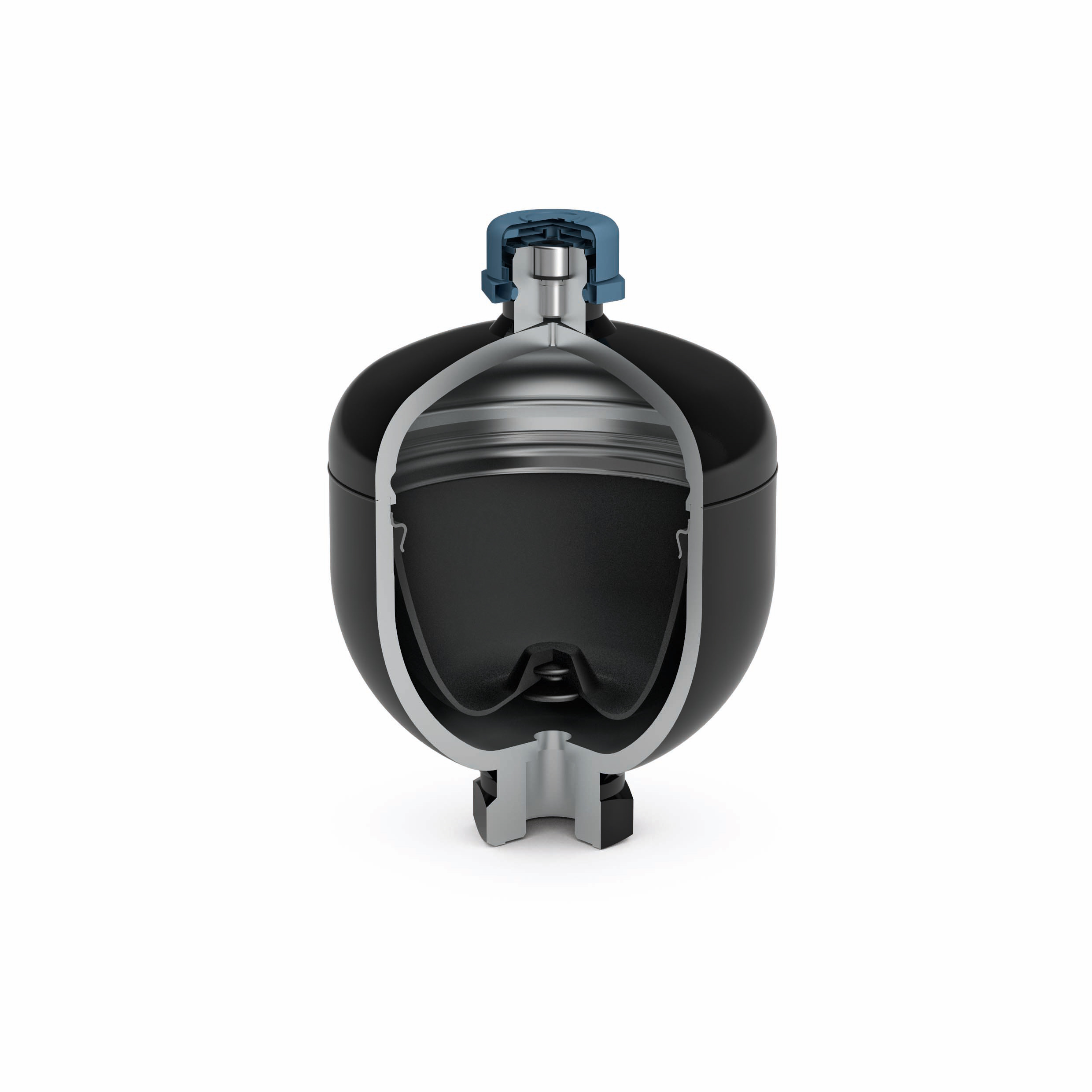 Aus diesem Grund hat Freudenberg Sealing Technologies ein neues Konzept zur Herstellung von Membranspeichern entwickelt: Der Fertigung benötigt weniger Prozessschritte, der Bauteilebedarf wird reduziert, die Montagezeiten verkürzt. Das Fügen der beiden Gehäusehälften aus Aluminium mit Hilfe der elektromagnetischen Pulsumformtechnik (EMPT) und die Stickstoffbefüllung der Gasseite erfolgen jetzt im gleichen Arbeitsschritt. Elektromagnetisches Pulsumformen nutzt starke magnetische Felder, um elektrisch leitfähige Werkstoffe berührungslos zu formen. Diese Technologie kann auch zum Fügen von zwei gleichartigen oder verschiedenen Werkstoffen eingesetzt werden. Dies nutzt Freudenberg Sealing Technologies zur stoffschlüssigen Verbindung von Ober- und Unterschale des Membranspeichers. Der neu entwickelte Prozess bietet eine hohe Stabilität und Bauteilsauberkeit. Dank dieses innovativen Prozesses und des Leichtbauwerkstoffs Aluminium erschließen sich neue Einsatzmöglichkeiten für Membranspeicher, beispielsweise in hydropneumatischen Fahrwerksanwendungen.