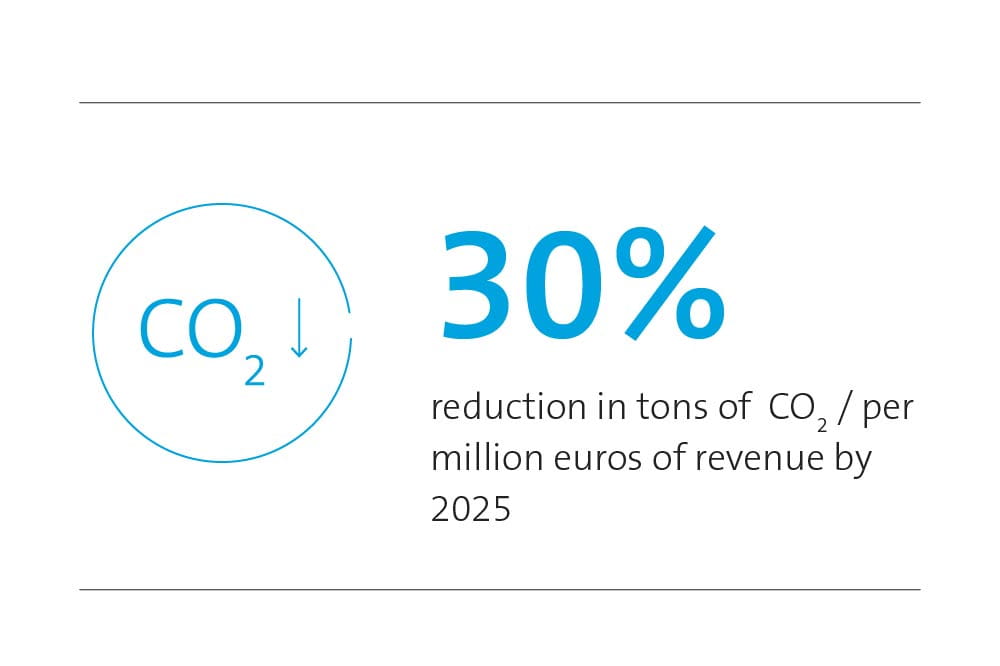 Unsere Erfolge im Klimaschutz machen wir durch Kennzahlen messbar und transparent. Ein ehrgeiziges Etappenziel auf dem Weg zur CO2-Neutralität haben wir bereits erreicht: Von 2020 bis 2025 ist es uns gelungen, unseren CO2-Ausstoß in Tonnen pro Million Euro Umsatz um 30 Prozent zu senken. Auf diesem Weg halten wir weiter Kurs.
