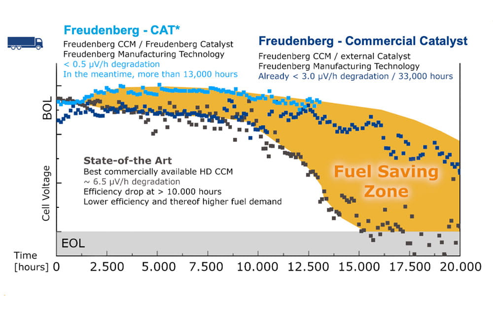 Freudenberg’s performance- and stability-optimized catalysts and electrodes—combined with a holistic metal management and recycling concept—thus make a significant contribution to reducing the total cost of ownership (TCO) of PEM fuel cell systems.